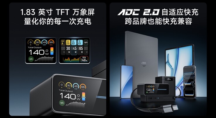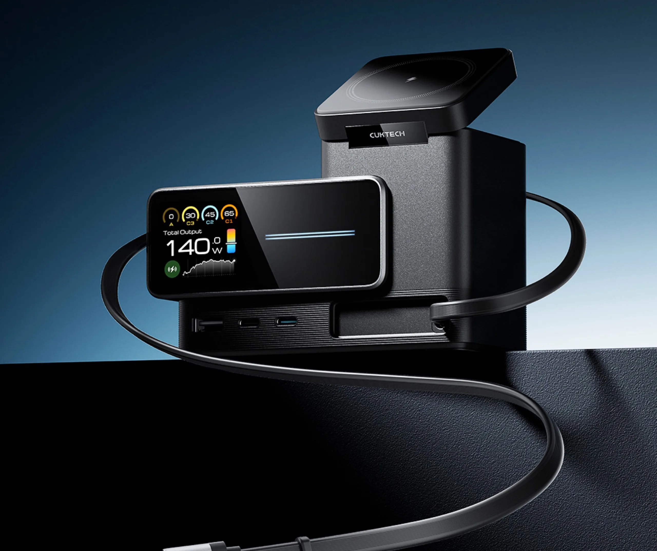 Die Cuktech 15 Super Charging Station soll eine All-in-One-Lösung sein, um alle Geräte auf einem Schreibtisch mit minimalem Kabelsalat aufzuladen. Die Ladestation kann insgesamt sechs Geräte zeitgleich laden. Das 70 Zentimeter lange USB-C-Ladekabel, das an der Vorderseite bei Bedarf ausgezogen werden kann, erlaubt es, Laptops mit bis zu 140 Watt zu laden.