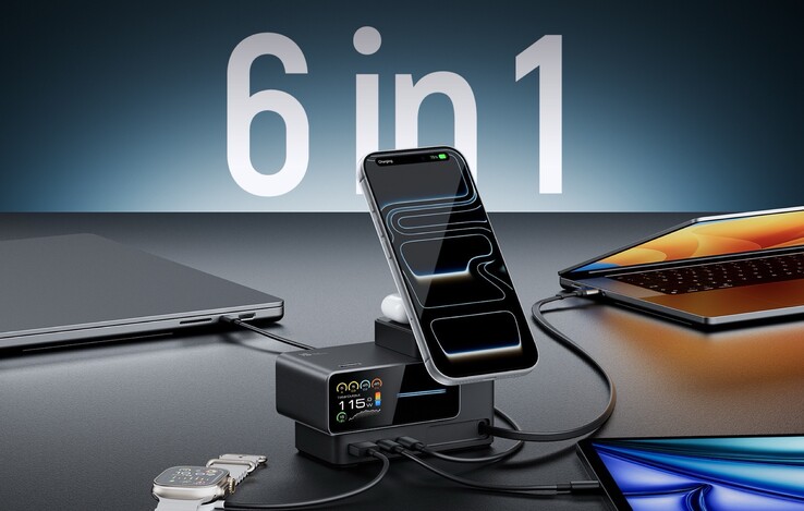 Zwei USB-C-Anschlüsse und ein USB-A-Port an der Vorderseite erlauben es, drei weitere Geräte verkabelt zu laden, allerdings sinkt die Leistung jedes Ports, wenn mehrere Anschlüsse zeitgleich verwendet werden. Darüber hinaus verbaut der Hersteller gleich zwei Qi-Ladespulen, um Smartphones oder auch komplett drahtlose Ohrhörer ganz ohne Kabel zu laden. Eine dieser Ladespulen besitzt einen Magnetring, um kompatible Smartphones wie das Apple iPhone 17 (ca. 950 Euro auf Amazon) oder das HMD Skyline aufrecht zu halten.
