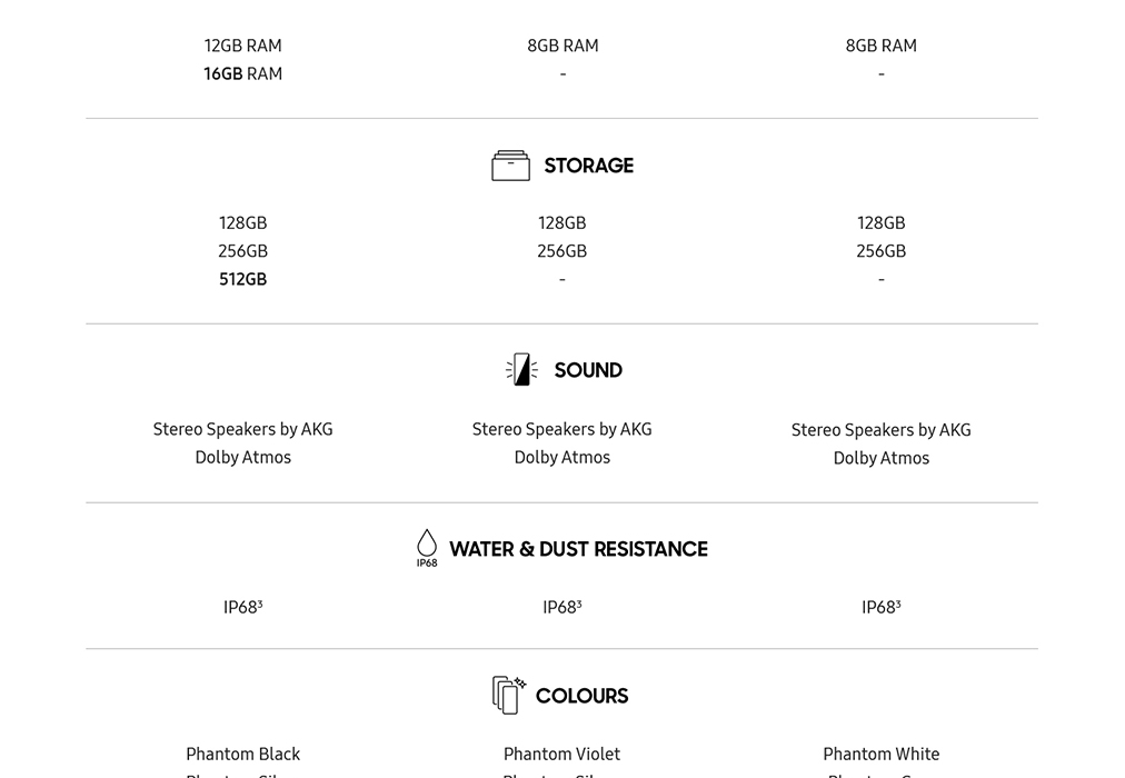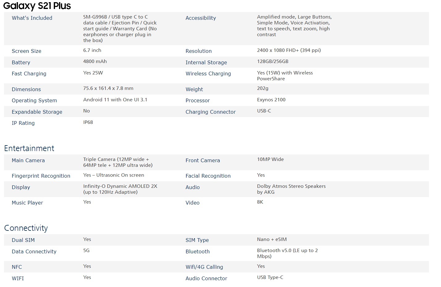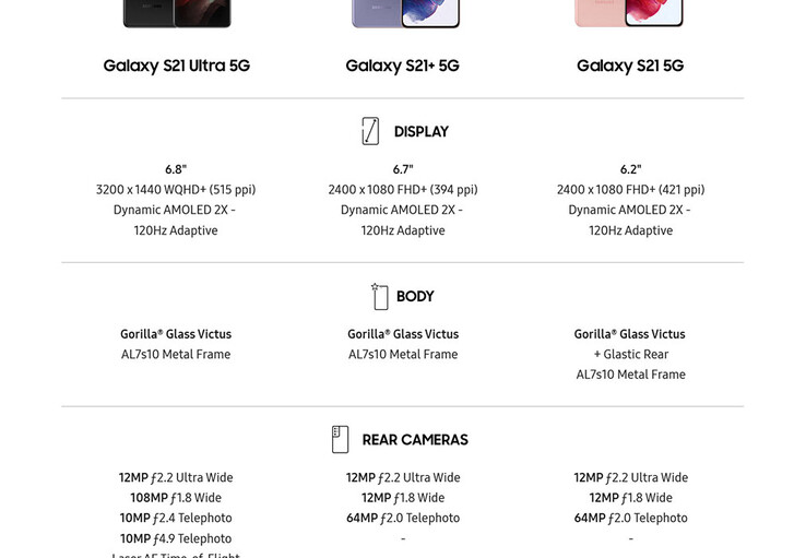 Der US-Leaker Evan Blass hat nun auch noch die gesamte Produktseite zur Galaxy S21-Serie ins Netz gestellt, die wir unten in einzelnen Bildern integriert haben. Sie bestätigt etwa die Plastik-Rückseite im regulären Galaxy S21, geht aber nicht auf die Themen Speicher-Erweiterung oder Dual-SIM ein.