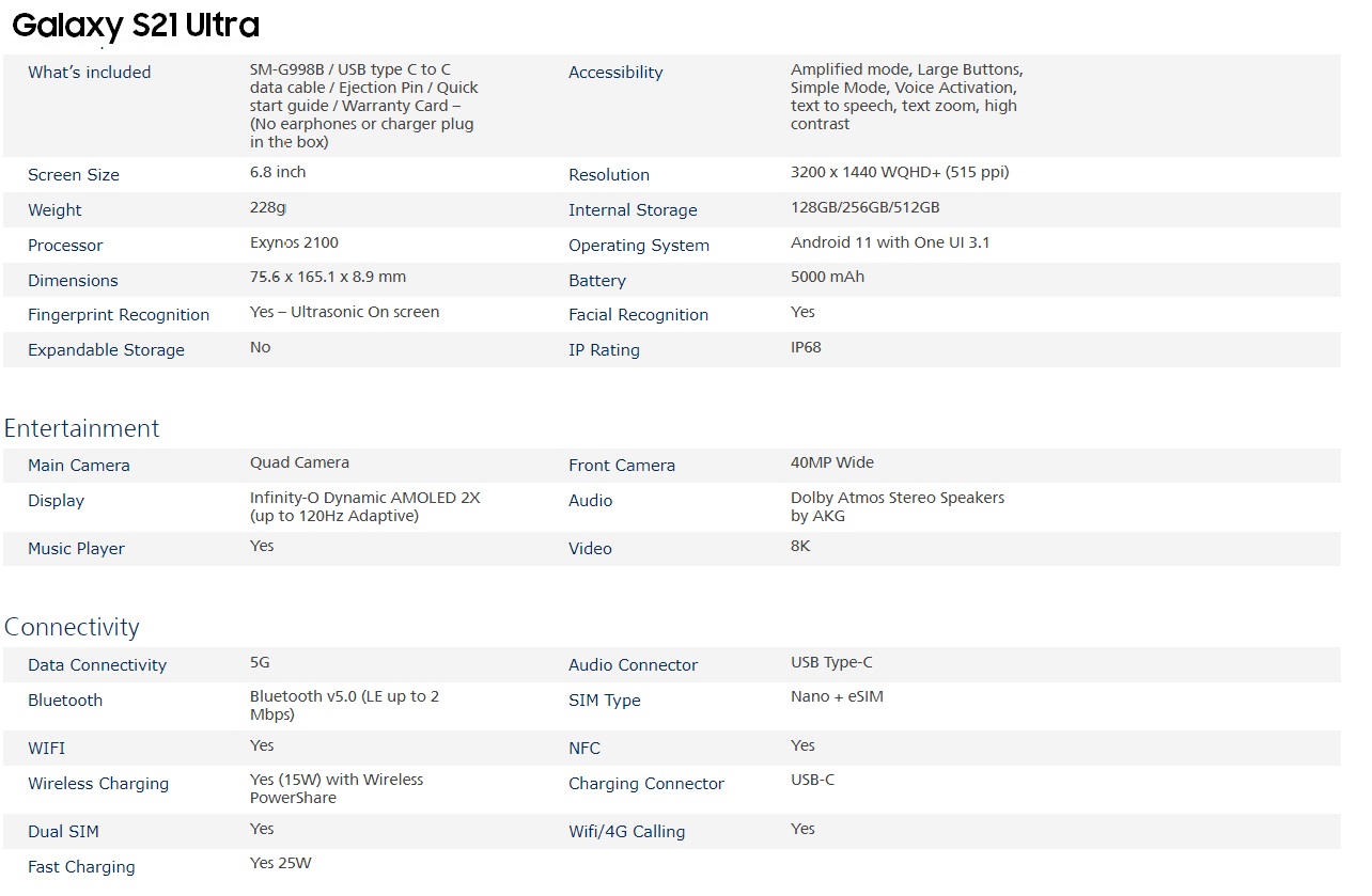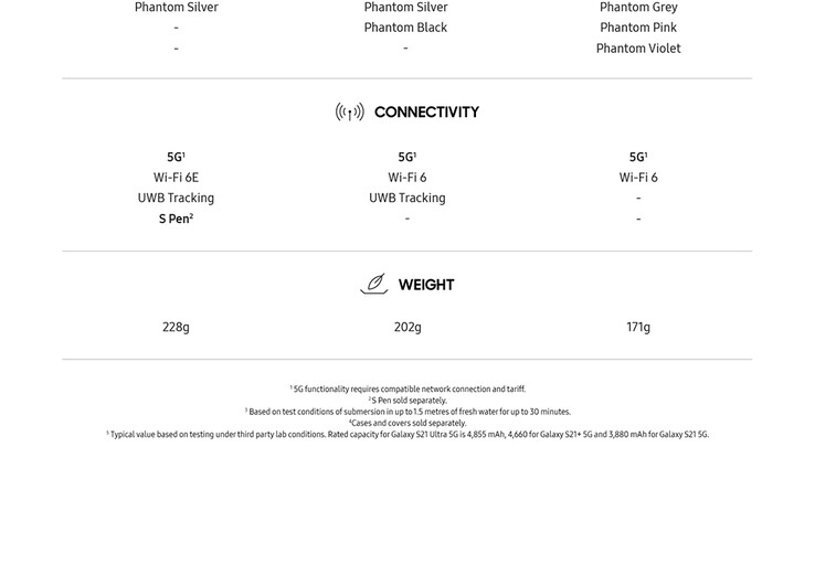 Auch nicht ganz happy dürften Käufer eines Galaxy S21 oder Galaxy S21+ sein, wenn sie ihren Speicher nachträglich aufrüsten wollen, denn im Gegensatz zu früheren Galaxy S-Generationen hat Samsung hier den Micro-SD-Slot eingespart. Zuletzt tauchten zwar Hinweise darauf auf, dass zumindest das Ultra-Modell noch erweiterbaren Speicher bieten werde, doch wie die nun ebenfalls geleakten Datenblätter zu allen drei Galaxy S21-Varianten zeigen, scheint dem nicht so zu sein. Unter dem Punkt "Erweiterbarer Speicher" steht hier bei allen drei Modellen ein "Nein". Wir werden sehen, ob das letztlich tatsächlich auch für die in Europa gedachten Varianten gilt, die ja auch einen Dual-SIM-Slot bieten sollen, nicht nur "Nano+ eSIM" wie in den Datenblättern hier. Es kann durchaus sein, dass die für Europa bestimmten Varianten auch beim Thema Micro-SD-Slot Unterschiede aufweisen. (zu weiteren Datenblättern siehe auch unten das Update)