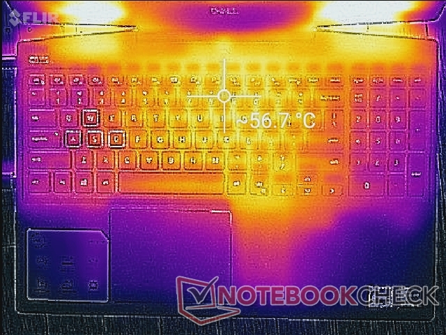 Die Oberflächentemperaturen fallen nicht besonders gut aus. Im Gaming-Betrieb erreichen die wärmsten Stellen bis zu 56 °C bzw. teilweise sogar bis zu 64 °C, wie die Wärmebilder unten zeigen. Zum Glück befinden sich die heißen Stellen im hinteren Bereich oder der Tastaturmitte und nicht bei den Handballenauflagen oder den WASD-Tasten. Trotzdem ist dies einer der wärmeren 15,6-Zoll-Laptops. Das konkurrierende Asus TUF A15 wird unter ähnlichen Bedingungen beispielsweise ebenfalls warm, aber definitiv nicht so warm wie unser Dell-Laptop.