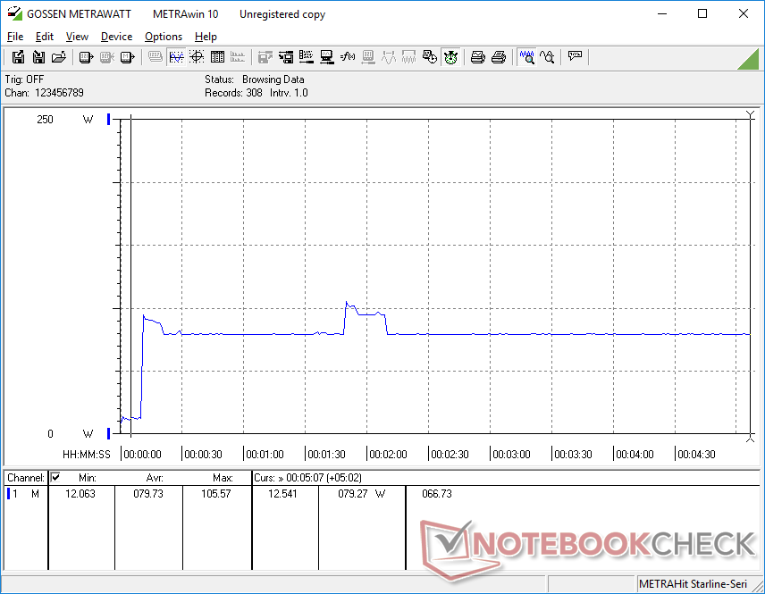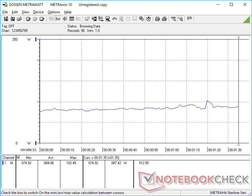 Der maximale Verbrauch, der dem großen (~20 x 10 x 2,9 cm) 240-W-Netzteil abverlangt wurde, liegt bei 180 W. Hier hätte Dell auch einen kleineres und leichteres Netzteil verwenden können, ohne Kompromisse bei der Leistung eingehen zu müssen.