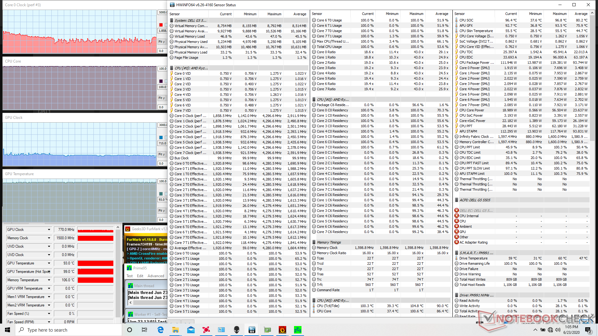 Im Gaming-Betrieb fallen die Temperaturen bedauerlicherweise ähnlich hoch aus. Beim Spielen von The Witcher 3 stabilisieren sich CPU und GPU zum Beispiel bei 99 °C bzw. 93 °C und werden damit überraschend heiß. Diese Messungen erklären auch die oben angesprochenen, sehr warmen Oberflächentemperaturen. Andere 15,6-Zoll-Gaming-Laptops mit der vergleichbaren Grafikkarte GTX 1660 Ti bleiben im Gaming-Betrieb kühler als unser Dell. Das Razer Blade 15 Basismodell und das Maingear Vector 15 befinden sich unter ähnlichen Gaming-Lasten jeweils im mittleren 80-°C-Bereich.