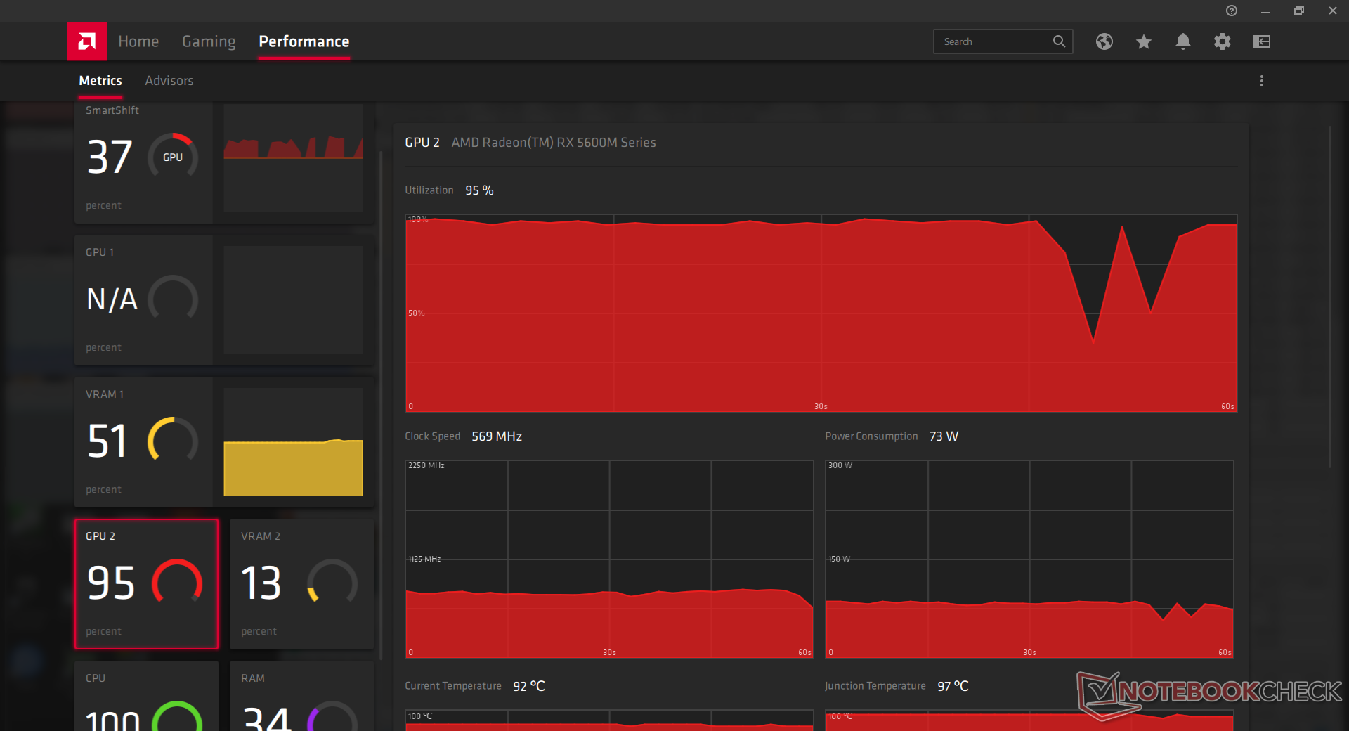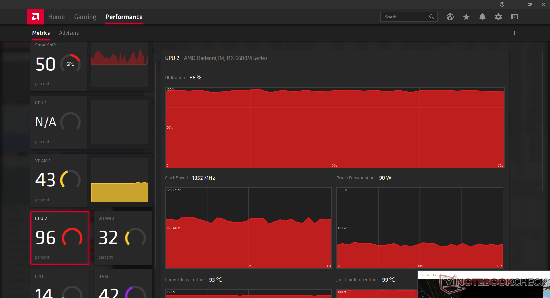 Nvidia-Laptops mit der vergleichbaren GeForce RTX 2060 haben bei der Leistung-pro-Watt immer noch die Nase vorn. Beim Spielen von The Witcher 3 verbraucht unser Dell-Testgerät beispielsweise durchschnittlich 153 W, wohingegen das Asus TUF A15 FA506IV 144 W und das Eluktronics RP-15 134 W verbraucht. Letztere sind mit der gleichen Ryzen-7-CPU, jedoch mit einer RTX-2060-GPU ausgerüstet.