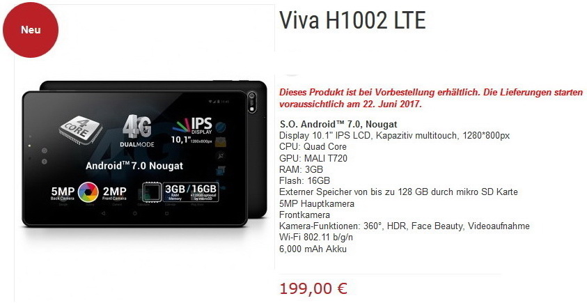 Die Tablets Viva H1002 LTE und Viva H802 LTE des rumänischen Anbieters Allview sind mit Touchscreens von 10,1 respektive 8 Zoll ausgestattet und bieten jeweils eine Auflösung von 1.280 x 800 Pixeln. Als Betriebssystem nutzen die beiden Allview-Tablets Google Android 7.0 Nougat. Beide Tablets sind im Onlineshop von Allview zu Preisen von rund 170 Euro (Viva H802 LTE) respektive 200 Euro (Viva H1002 LTE) vorbestellbar. Die Lieferung zum Kunden beginnt voraussichtlich am 22. Juni 2017.