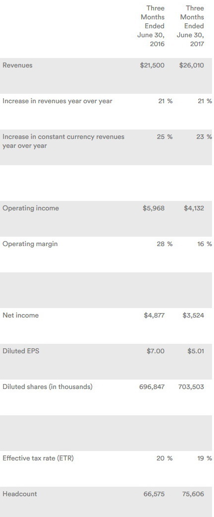 Trotz der EU-Rekordstrafe in Höhe von 2,42 Milliarden Euro kann Google-Mutter Alphabet in den Geschäftszahlen für das 2. Quartal 2017 Ende Juni einen Gewinn von 3,524 Milliarden US-Dollar ausweisen. Im Vergleich zu den 4,877 Mrd. Dollar Nettogewinn aus Q2/2016 stellt dies allerdings einen Gewinneinbruch von 27,7 Prozent dar. Ohne die EU-Strafe hätte der Nettogewinn 6,260 Mrd. Dollar betragen.