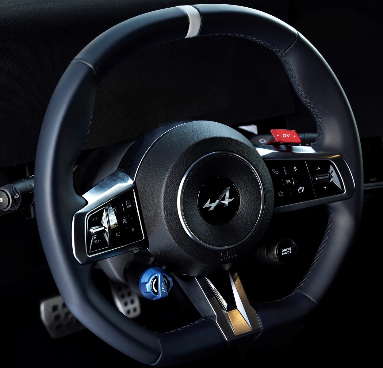 Auf dem Testparcours im eisigen Norden hat die Alpine A290 einen weiteren Blickfang im Interieur präsentiert: das exklusive, abgeflachte Sportlenkrad von Alpine aus Nappaleder. Es verfügt über eine Mittelmarkierung, die an die Rennsporttradition von Alpine erinnert. Darüber hinaus sind drei Funktionen integriert, die direkt aus der Formel 1 übernommen wurden: die Überholtaste (Overtake; OV), die Recharge-Funktion (RCH) und die Möglichkeit, die Fahrmodi mit nur einem Tastendruck (One Touch) zu wechseln.