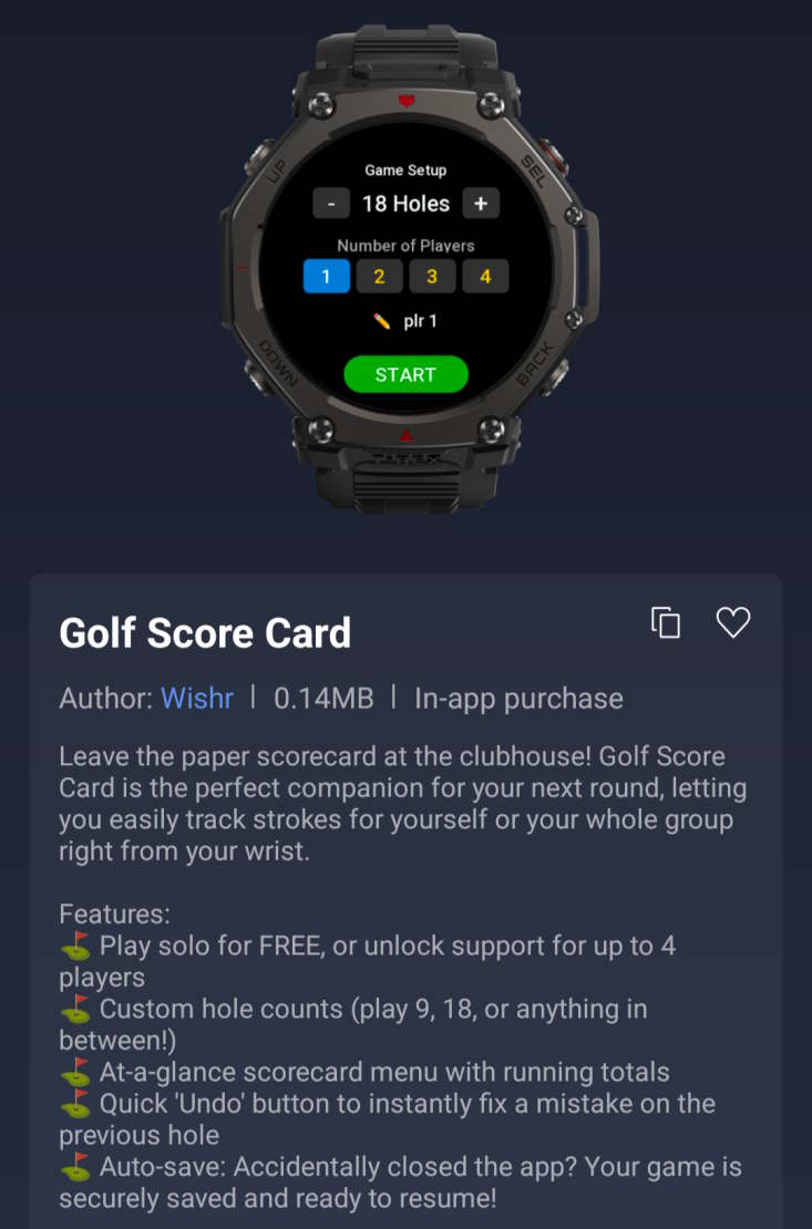 Für Golfsportler relevant dürfte die Golf Score Card sein. Die App ist kostenfrei für einen Golfspieler, kostenpflichtig ist die Nutzung mit bis zu vier einzelnen Spielern möglich. Die App muss dabei etwa in einer Pause nicht aktiv bleiben, es gibt eine automatische Speicherung. Die kostenfreie App LiftGo soll für Kraftsportler zusätzliche Optionen bieten und unterstützt etwa Workout-Vorlagen und einen Timer für die Einhaltung von Pausenzeiten.