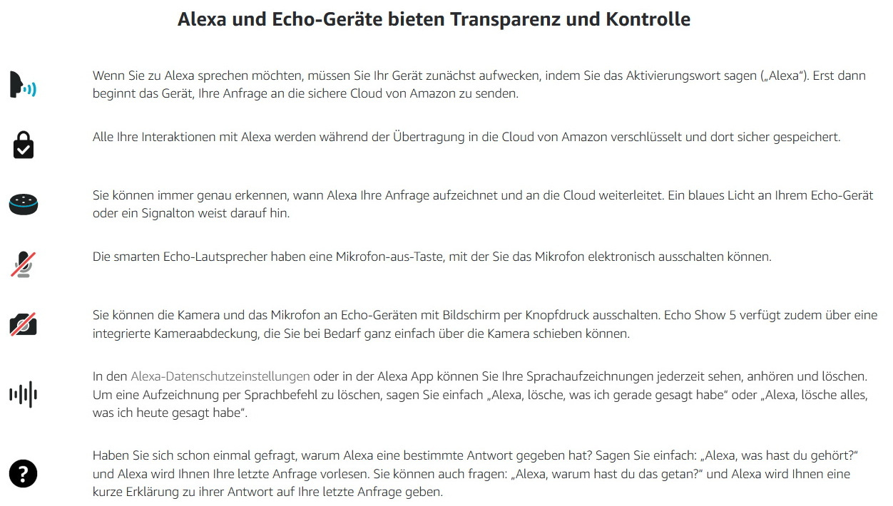Neben den bestehenden Sprachbefehlen wie "Alexa, lösche, was ich gerade gesagt habe" und "Alexa, lösche alles, was ich heute gesagt habe" versteht Alexa nun beispielsweise auch "Alexa, lösche alles, was ich gesagt habe". Damit werden alle zuvor gespeicherten Sprachaufnahmen gelöscht. Mit "Alexa, wie kann ich meine Datenschutz-Einstellungen überprüfen?" zeigt Alexa in der Alexa-App einen direkten Link zu den konkreten Alexa-Datenschutz-Einstellungen an.