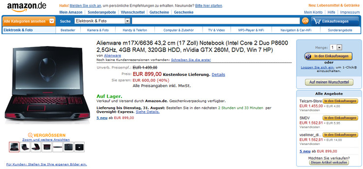 Folgend die Eckdaten des Alienware M17x bei amazon.de:
