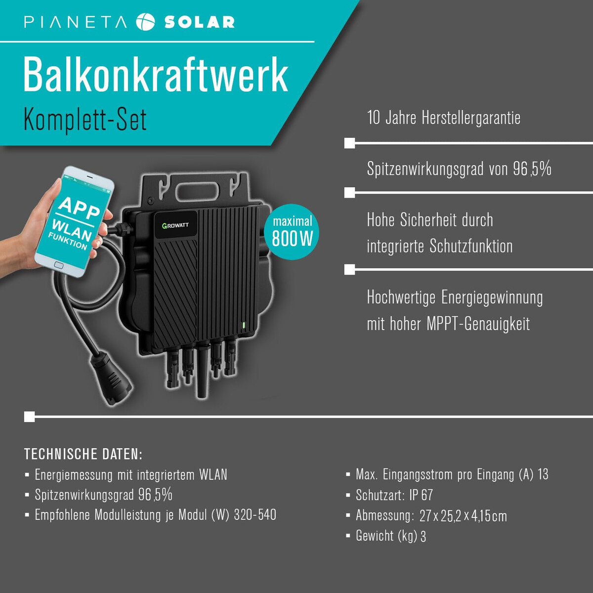 Amazon bietet ein Balkonkraftwerk mit Rabatt und dem beliebten Wechselrichter Growatt NEO-800M-X an (Bildquelle: Pianeta)