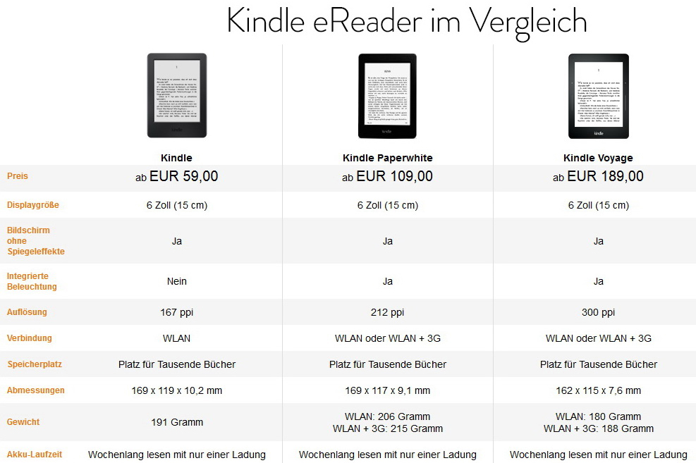Die neue Kindle E-Book-Reader Familie von Amazon.com besteht nun aus Kindle mit Touchscreen, Kindle Paperwhite und Kindle Voyage. Der neue eReader Kindle verfügt zu Preisen ab 60 Euro jetzt über ein um 20 Prozent schnelleren Prozessor mit 1 GHz, doppelt so viel Speicherplatz (4 GByte) und ab sofort auch über einen 6-Zoll-Touchscreen mit 167 ppi und 16 Graustufen.