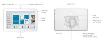 Der integrierte Smart-Home-Hub des Echo Hubs unterstützt Zigbee, Thread, Bluetooth und Matter und sorgt für die Kompatibilität mit weltweit über 140.000 verschiedenen Smart-Home-Geräten wie vernetzten Kameras, Leuchten, Schlössern, Steckdosen, Thermostaten oder Lautsprechern. Amazons Echo Hub unterstützt Bluetooth, WLAN 802.11a/b/g/n/ac oder, über einen kompatiblen, optionalen Power-over-Ethernet (PoE)-Adapter, auch kabelgebundene Internetverbindungen. Die Stromversorgung des Echo Hub erfolgt über ein 12,5-Watt-Netzteil.