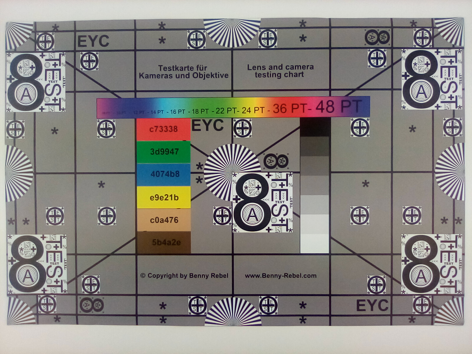 Die Ablichtung des Testcharts zeigt sich ebenfalls mit kräftigen Farben. Es treten aber bereits in der Bildmitte unscharfe Bereiche auf, die sich zu den Rändern hin verstärken. In den Ecken stellt sich zudem eine sichtbare Blässe ein.