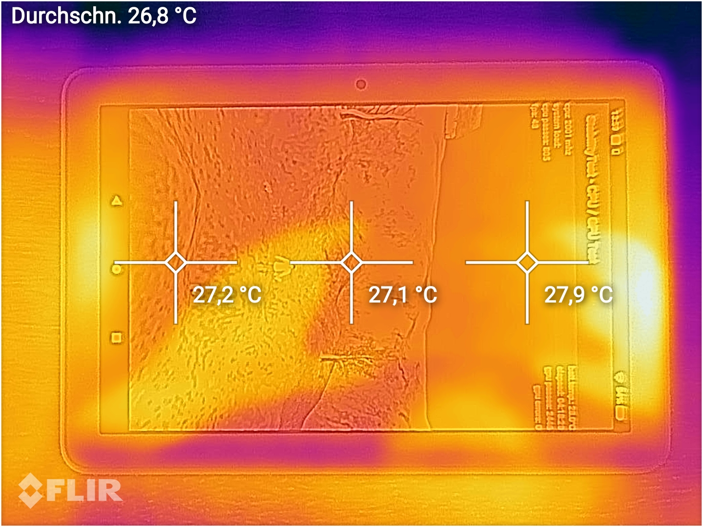 Die Oberflächentemperaturen des Fire HD 8 (2020) steigen in unserem Test unter Last auf maximal 30,5 °C. Damit wird das Tablet nie zu heiß und kann jederzeit problemlos zum Beispiel in der Hand gehalten werden.