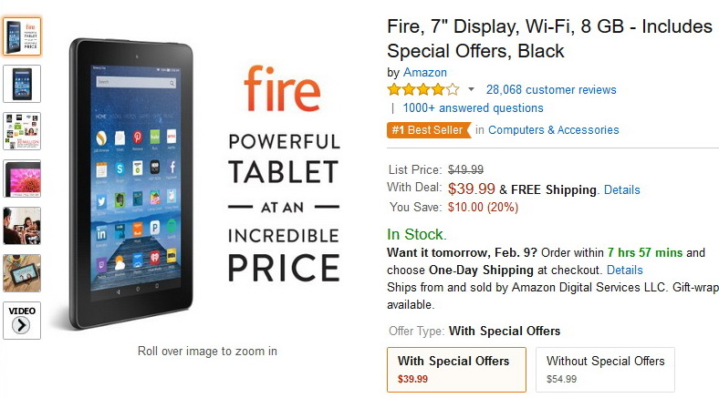 Mit Einblendung von "Special Offers" aka Spezialangeboten auf dem 7-Zoll-Display des Fire Tablet-PCs, das mit 1024 x 600 Pixeln auflöst, werden in den USA hingegen 55 US-Dollar fällig. In Deutschland kostet das günstigste Amazon-Fire-Tablet gegenwärtig rund 60 Euro. Mit Werbeeinblendung in Form von Spezialangeboten. Ohne Werbung will Amazon Deutschland zurzeit für das 7-Zoll-Tablet 75 Euro haben.