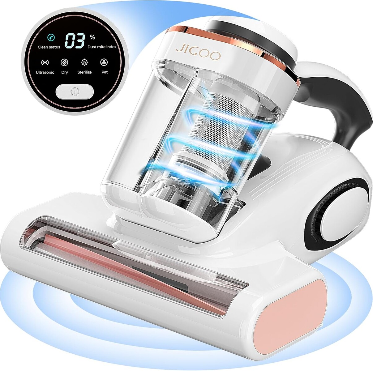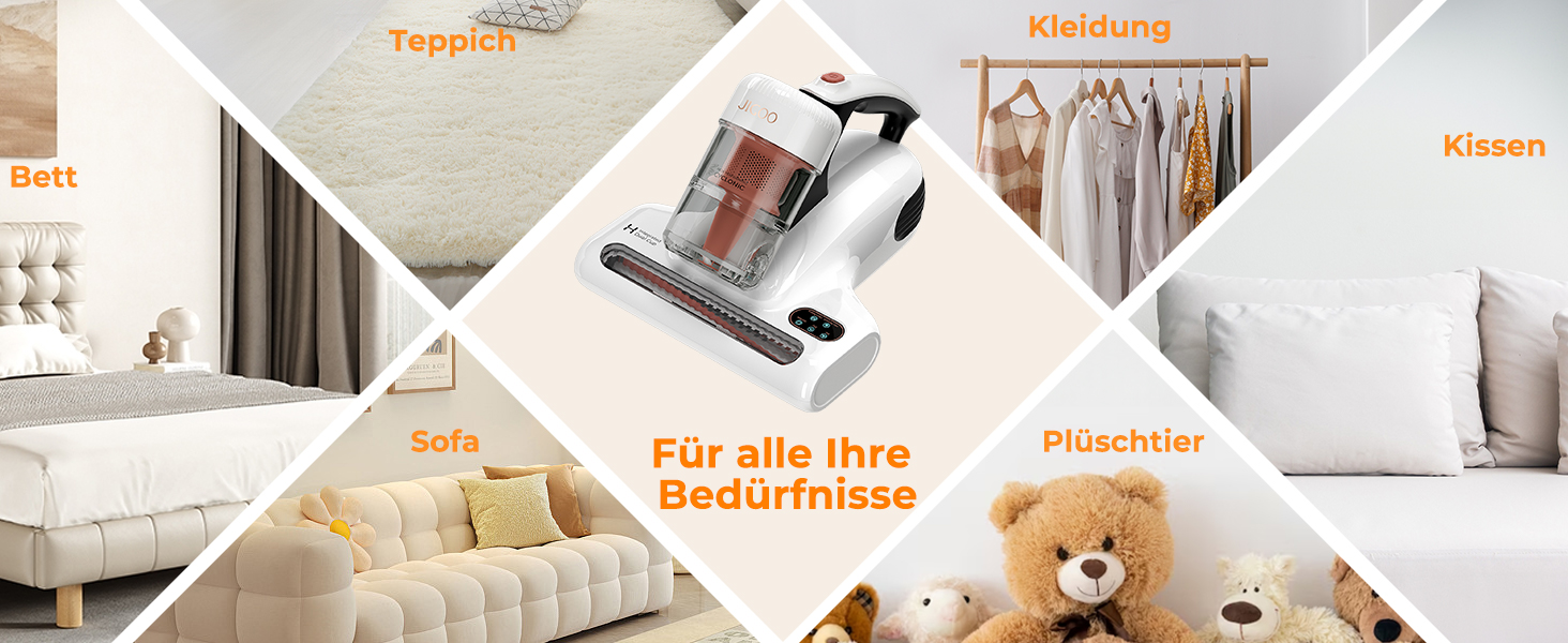 Der Jigoo J200 weist Leistungsdaten von 500 W und 13 kPa auf und zeigt auf seinem LED-Display ebenfalls viele Informationen an, darunter den Echtzeitstatus der Milbenmenge. Das Gerät beseitigt diese neben der hohen Saugleistung ebenfalls per 60 °C heißer Luft sowie UV-Licht und Ultraschall mit einer Milbenentfernungsrate von 99,9 Prozent. Hierbei ist das Gerät mit 76 dB im Betrieb angenehm leise.