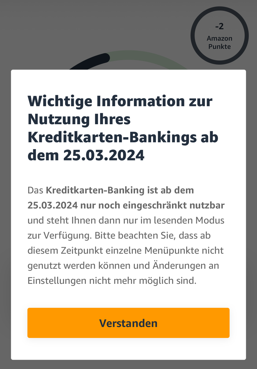 So heißt es in der App: "Das Kreditkarten-Banking ist ab dem 25.03.2024 nur noch eingeschränkt nutzbar und steht Ihnen dann nur im lesenden Modus zur Verfügung. Bitte beachten Sie, dass ab diesem Zeitpunkt einzelne Menüpunkte nicht genutzt werden können und Änderungen an Einstellungen nicht mehr möglich sind."