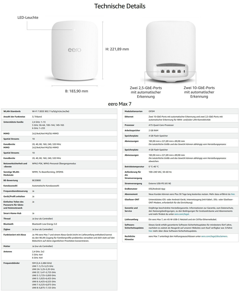 Der eero Max 7 bietet eine einfache Einrichtung und Verwaltung über die eero App. Er ist auch mit früheren Generationen von eero-Geräten kompatibel. Für Sicherheit sorgt der Hersteller mit automatischen und kontinuierlichen Software-Updates. Der eero Max 7 wird laut Amazon in Kürze zu einem Preis von knapp 700 Euro in Deutschland erhältlich sein.