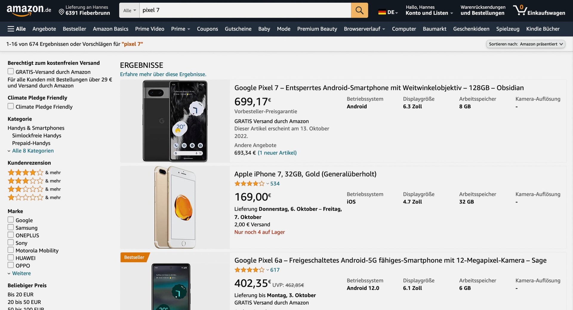 Amazon Deutschland listet das Smartphone dagegen für 699,17 Euro, obwohl die Mehrwertsteuer in Deutschland um zwei Prozentpunkte niedriger ist als in Spanien. Der unrunde Betrag deutet darauf, dass es sich dabei eher um einen Platzhalter handelt. Beide Preise sind allerdings deutlich günstiger, als eine direkte Umrechnung des US-Preises von 599 US-Dollar nach dem aktuellen Wechselkurs plus 19 Prozent Mehrwertsteuer, denn rein rechnerisch würde das Pixel 7 in Deutschland rund 736 Euro kosten. Nachdem das Gerät kaum Neuerungen bietet, hat sich Google offenbar dazu entschlossen, auf einen Teil der Gewinnmarge zu verzichten, um den Listenpreis beibehalten zu können.