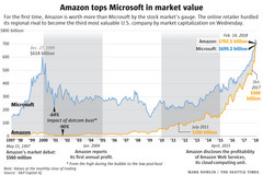 Über die letzten drei Jahre konnte der Versandhändler damit seinen Wert um das vierfache steigern, was dessen Gründer und CEO Jeff Bezos zum reichsten Mann weltweit aufsteigen ließ. Zum Zeitpunkt des Börseneinstiegs von Amazon war Microsoft bereits ein milliardenschweres Unternehmen, nun zieht Amazon am Windows-Produzenten vorbei.