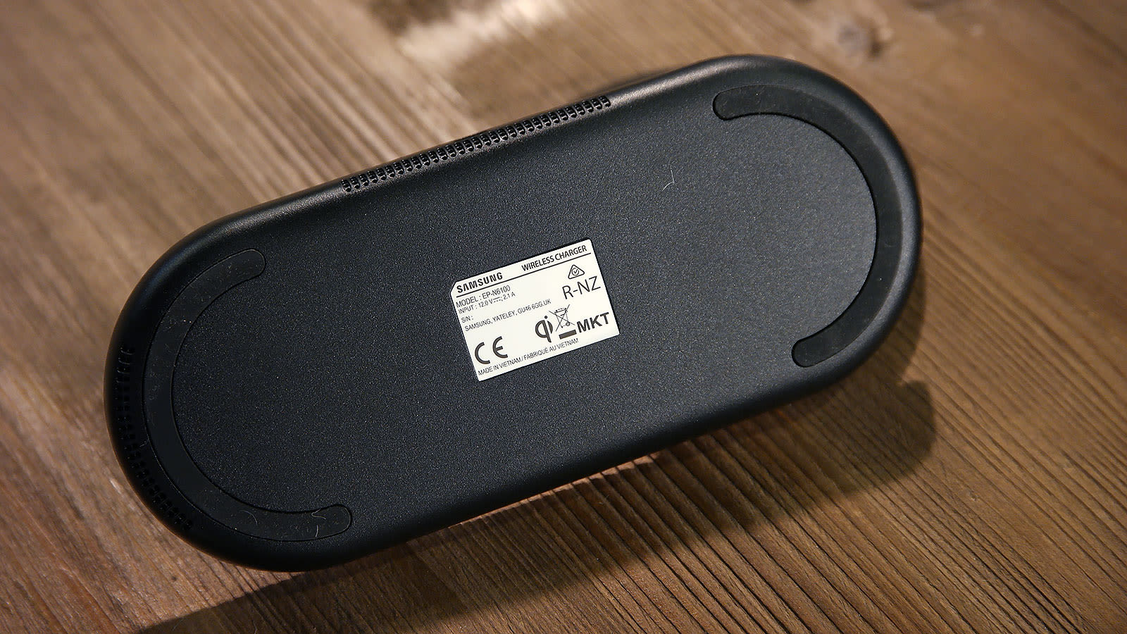 Was den bei Amazon zu sehenden Samsung Galaxy Wireless Charger Duo angeht heißt es in dem Bericht, dass der Charger über zwei Qi-kompatible Ladepads verfügt, die über einen USB-C-Eingang mit Energie versorgt werden. Auf dem Modelllabel an der Geräteunterseite des EP-N6100 ist eingangsseitig 12 V/2,1 A zu lesen. Außerdem ist auf den Fotos zu sehen, dass der Duo-Lader von Samsung über zwei Lade-LEDs verfügt.