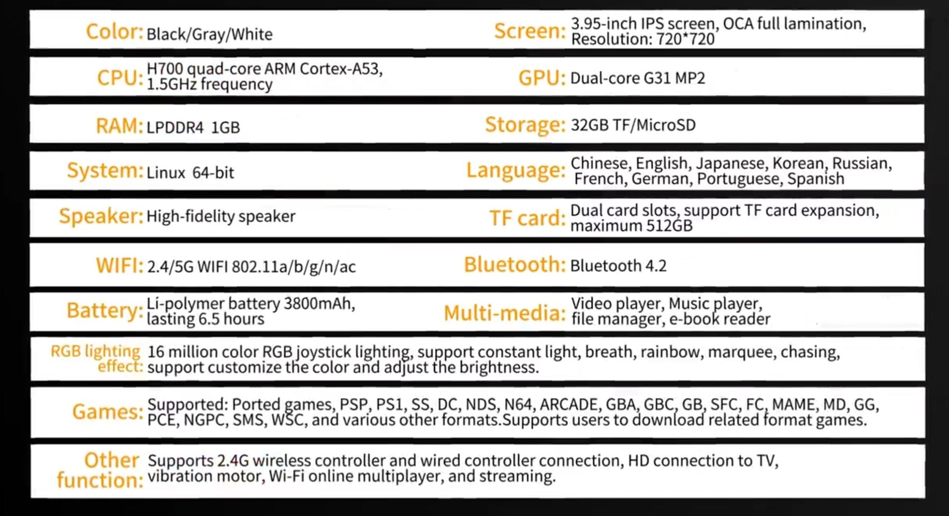 Der 3,95 Zoll große Bildschirm löst mit 720 x 720 Pixeln auf, damit dürften sich recht häufig schwarze Ränder ergeben. Der Anschluss eines externen Displays ist möglich, Controller lassen sich über Bluetooth anschließen und Multiplayer-Gefechte über WiFi führen. Der LPDDR4-Arbeitsspeicher ist einen Gigabyte groß, es kommt eine 64-Bit-Linux-Version zum Einsatz. Zwei Speicherkartenslots sind vorhanden, auf einer der beiden Karten findet dann typischerweise das Betriebssystem Platz. Als Betriebssystem kommt eine angepasste 64-Bit-Linux-Variante zum Einsatz, es sollen sich Videos und Musik abspielen lassen. Verbaut ist ein 3.800 mAh starker Akku, der eine Laufzeit von bis zu 6,5 Stunden mitbringen soll. Zum Preis oder dem genauen Release-Termin liegen noch keine Informationen vor, die Veröffentlichung dürfte aber noch in diesem Monat erfolgen.