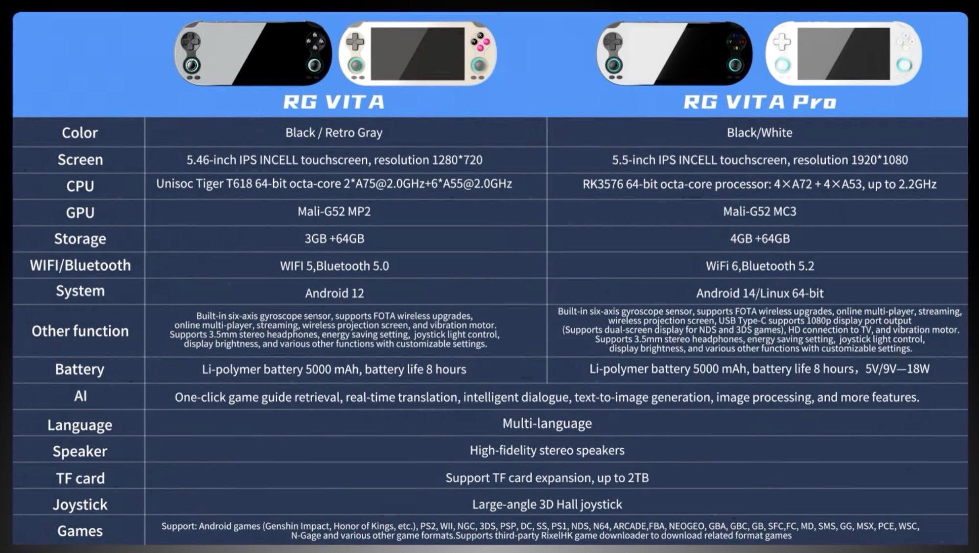 Der 5,5 Zoll Touchscreen erreicht beim RG Vita Pro eine höhere Auflösung von 1.920 x 1.080 Pixel, während das Topmodell Wi-Fi 6 und Bluetooth 5.2 unterstützt. Nutzer haben die Wahl zwischen Android 14 und Linux. Der USB-C-Anschluss unterstützt 1.080p-Monitore, und erlaubt laut Anbernic die Nutzung eines Zweitdisplays, wenn Nintendo DS Spiele gezockt werden. Beide Varianten des Anbernic RG Vita besitzen einen 5.000 mAh Akku, der eine Laufzeit von acht Stunden ermöglichen soll, sowie Drift-resistente Hall-Effekt-Analog-Sticks.
