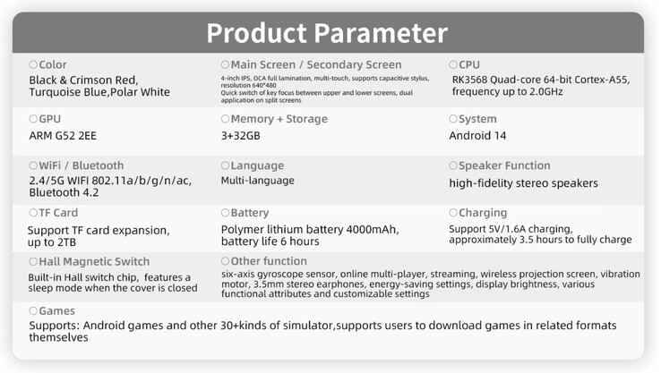 Darüber hinaus werden native Android-Spiele sowie Spiele-Streaming über WLAN unterstützt. Der Anbernic RG DS setzt auf Android 14. Der 4.000 mAh Akku soll eine Laufzeit von sechs Stunden ermöglichen, eine volle Ladung über USB-C dauert fünf Stunden. Der Handheld erkennt durch einen Sensor, wenn dieser zugeklappt wird, um den Standby-Modus automatisch zu aktivieren. Stereo-Lautsprecher, ein 3,5 mm Kopfhöreranschluss, ein Vibrations-Motor und ein Beschleunigungssensor runden die Ausstattung ab.