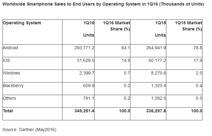 Laut dem Marktforschungsinstitut Gartner ist Google Android auch weiterhin das dominierende mobile Betriebssystem im ersten Quartal 2016. Der weltweite Marktanteil ist sogar auf 84,1 Prozent gestiegen, ein Plus von 5,3 Prozent im Vergleich zum selben Quartal des letzten Jahres. In absoluten Zahlen heißt das: Es wurden circa 28 Millionen mehr Geräte mit Android verkauft.