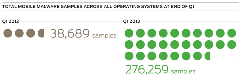 Der Anstieg der schädlichen Programme von stolzen 614 % innerhalb nur eines Jahres kann laut Experten durch einige Faktoren erklärt werden. Da wären der 75 % Marktanteil von Android (laut Gartner), der das Betriebssystem für Kriminelle am interessantesten macht. Das selbe Programm für iOS hätte deutlich geringere Verbreitung und somit geringeren zu erwartenden Profit. Andererseits seien viele Konsumenten sich schlicht und einfach nicht bewusst, dass sich Viren nicht nur auf PCs beschränken, und gingen deshalb oft leichtsinnig mit potentiellen Gefahren um.
