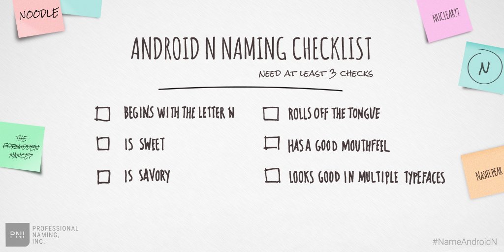 Zuvor hatte Google noch eine kurze "Checkliste" für das Android-N-Naming getwittert. Laut der Checklist soll der künftige und offizielle Name von Android N mindestens drei der angeführten Kriterien erfüllen:
