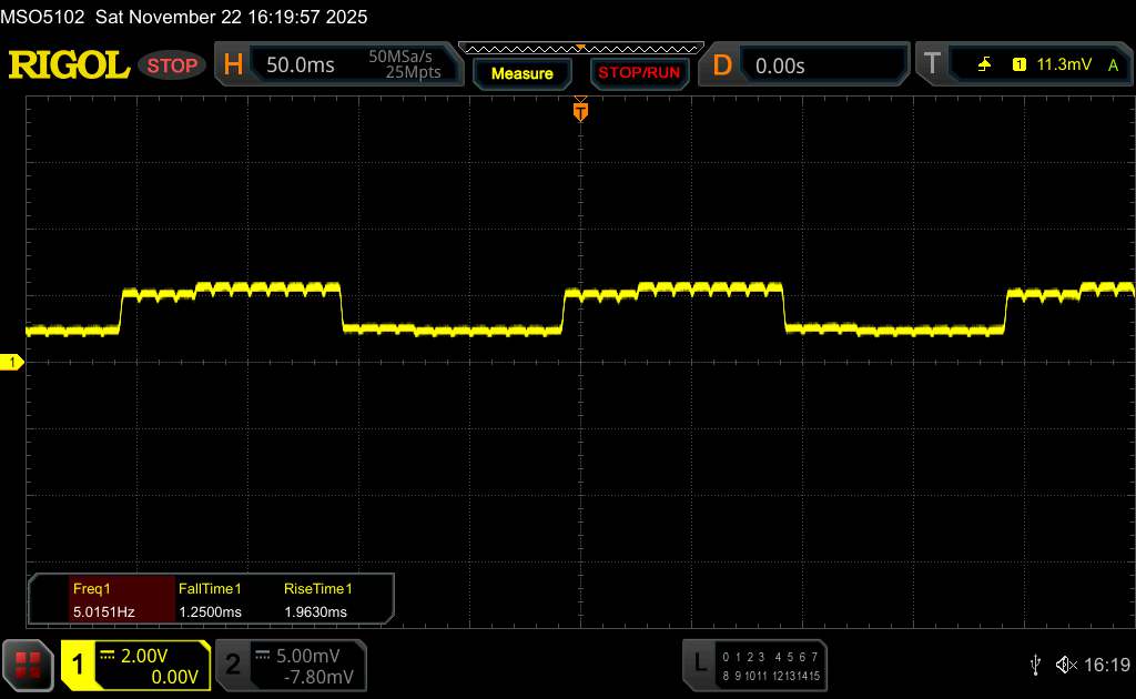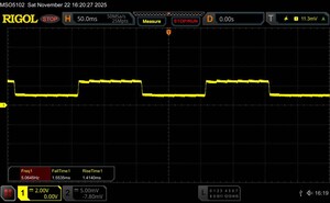 Da es sich um ein OLED-Panel handelt, wird die Bildschirmhelligkeit mittels Pulsweitenmodulation gesteuert. Laut Hersteller setzt das iQOO 15 auf eine Hochfrequenz-PWM-Dimmung mit 2.160 Hz, wodurch potenzielle negative Effekte, wie Flackern, reduziert werden. Unsere Messungen mit der Rigol-Software ergeben ein Grundfrequenz von etwa 560 Hz.