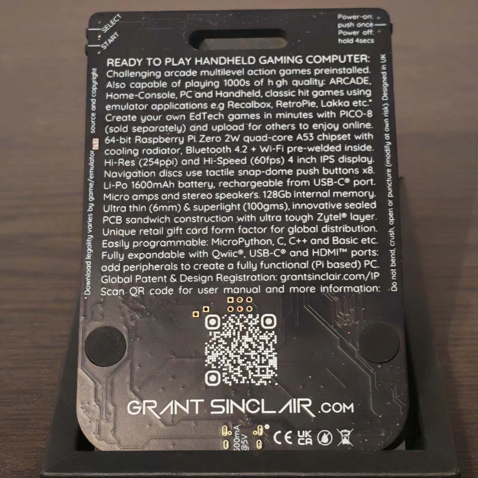 Das 4 Zoll große Display bietet eine Pixeldichte von 254 PPI (720 × 720 Pixel) und löst damit scharf auf. Die beiden Lautsprecher sind für einen solchen, kompakten Gaming-Handheld durchaus ordentlich. Die Nutzung mit einem externen Display und auch etwa einem USB-Hub ist vorgesehen. Damit kann die GamerCard dann wie ein typischer Einplatinenrechner genutzt werden und für eigene Projekte. Auch hierbei gibt es Limitationen bei der Hard- und Software: So gibt es zwar QWIIC, allerdings keine vollständige Stiftleiste und das installierte Raspberry Pi OS kommt sozusagen nackt. Eine wie auch immer geartete, zusätzliche Motivation, mit eigenen Projekten zu starten gibt es nicht.