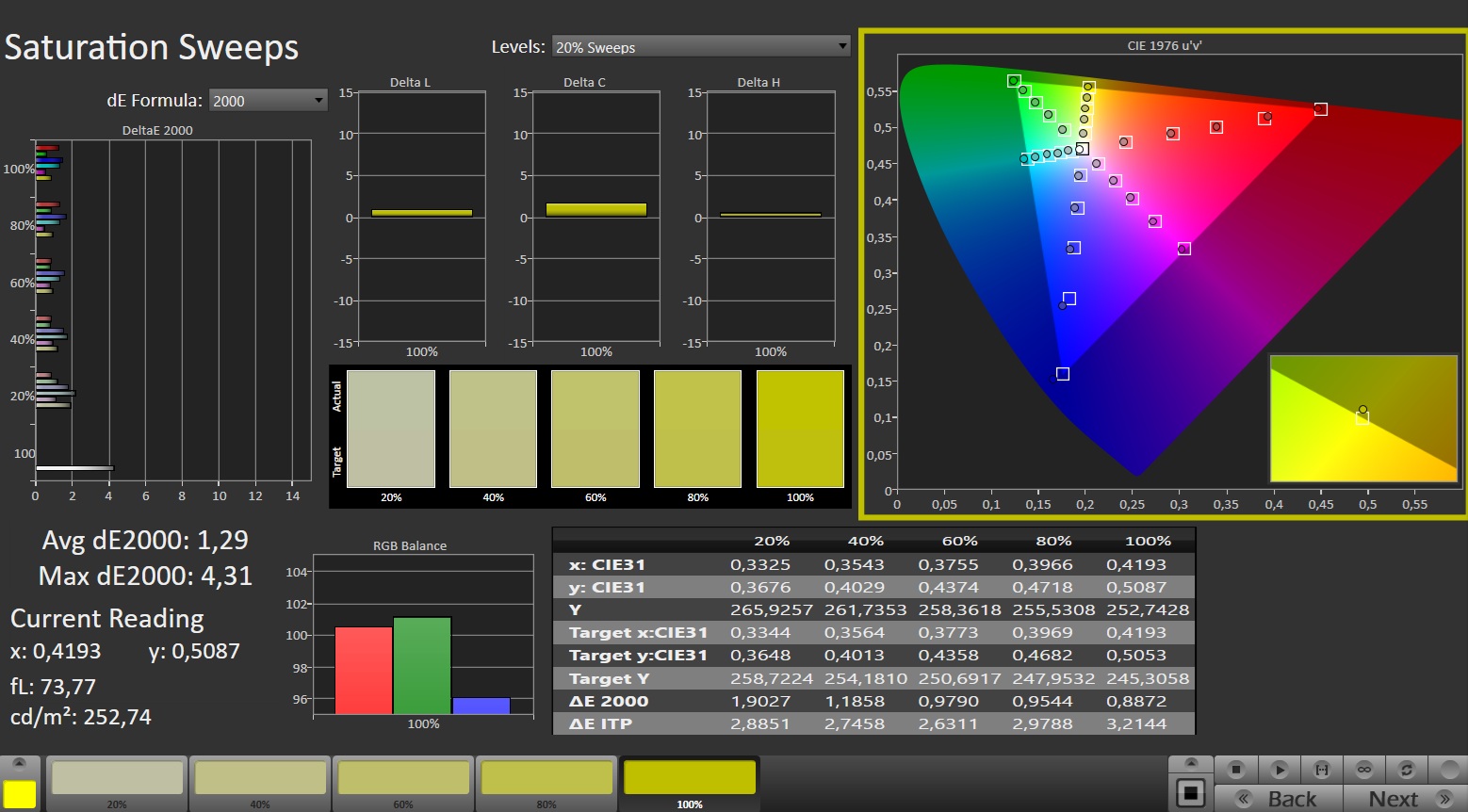 | Delta E Colorchecker * | 1.45 | 3.05 -110% | 4.73 -226% | 3.11 -114% | 2.4 -66% | 1.61 -11% |