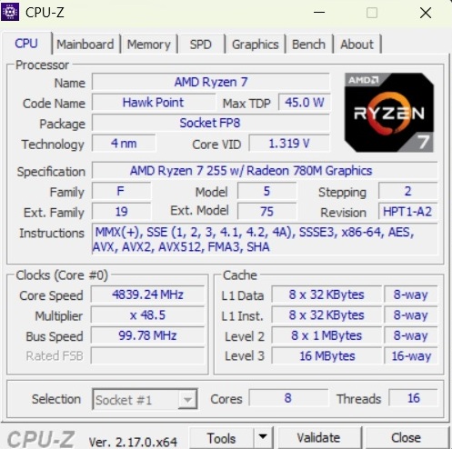 Den Ryzen 7 255 entdeckt man bisher eher selten in Notebooks. Das 4-nm-Modell bietet acht Kerne und kann bis zu 16 Threads parallel bearbeiten. Im Gegensatz zum Core i7-14700HX des Tulpar T6 V3.5 bleibt die Performance auch bei längerer Belastung konstant, wobei es nicht für das Level des Core Ultra 7 255HX, Core Ultra 9 275HX, Ryzen 9 8940HX und Ryzen AI 9 HX 370 reicht.