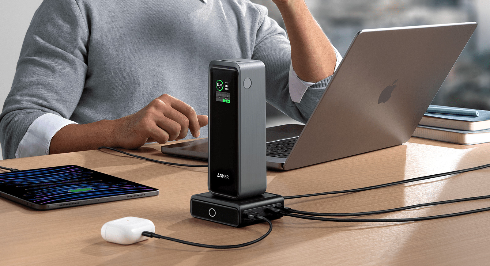 Hierbei handelt es sich um eine Tischladestation, mit der sich die Powerbank drahtlos mit bis zu 100 W laden lässt. Zudem bietet das Gerät drei USB-Ports (2x USB-C mit 100/30W, 1x USB-A mit 22,5 W) für die Versorgung weiterer Geräte. Die Anker 100W Ladestation kann auch einzeln bei Anker oder Amazon erworben werden und kostet laut UVP 59,99 Euro.