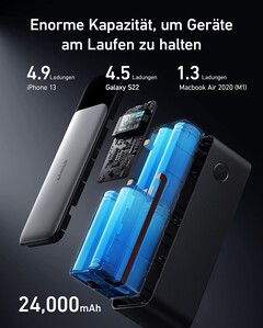 Der verbaute Energiespeicher weist eine Kapazität von 24.000 mAh auf. Dies langt zum fünfmaligen Laden eines iPhone 13. Ein iPad Pro 12,9'' kann 1,3-mal mit der Anker 737 Powerbank mit neuer Energie versorgt werden. Dank Power Delivery 3.1 und einer hohen Ausgangsleistung von bis zu 140 Watt können auch viele andere Geräte wie Notebooks, MacBooks und Co binnen kurzer Zeit mit dem externen Akku geladen werden.
