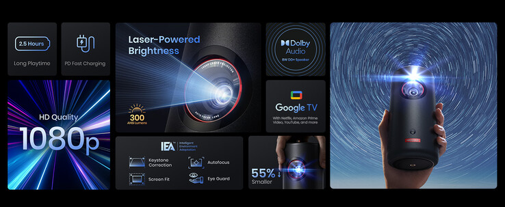Ansonsten ist die neue Version mit Google TV identisch mit der bereits von uns ausprobierten Version des Nebula Capsule 3 Laser. Der ultrakompakte Beamer wartet mit einer 1080p-Auflösung, 300 ANSI Lumen, diversen Bildanpassungen sowie Dolby Audio Lautsprechern und einem Akku für 2,5 Stunden Spielzeit auf. Zudem stehen bei Anker bekanntermaßen noch zwei weitere Beamer mit Google TV in den Startlöchern: Cosmos 4K SE und Capsule Air.