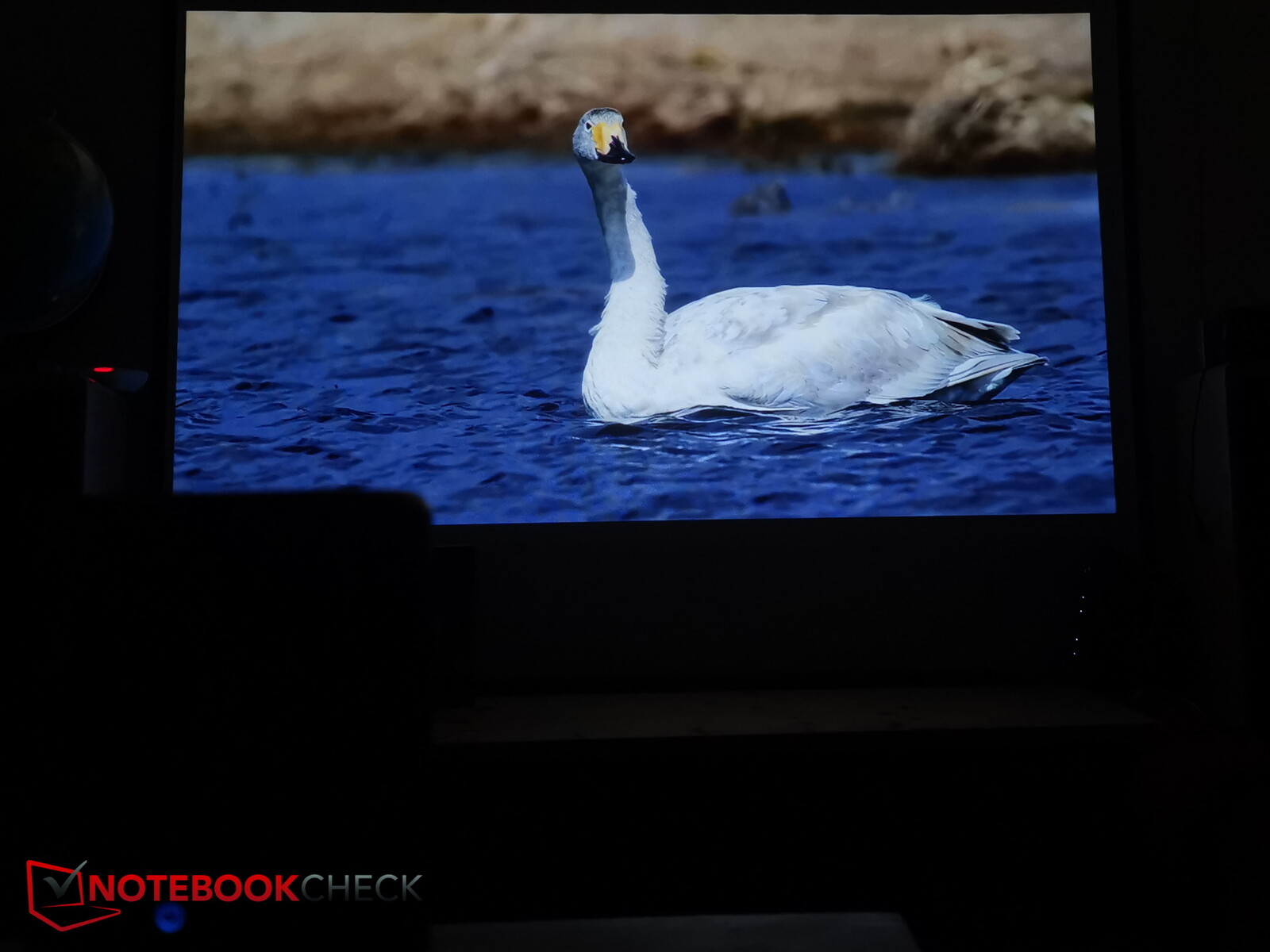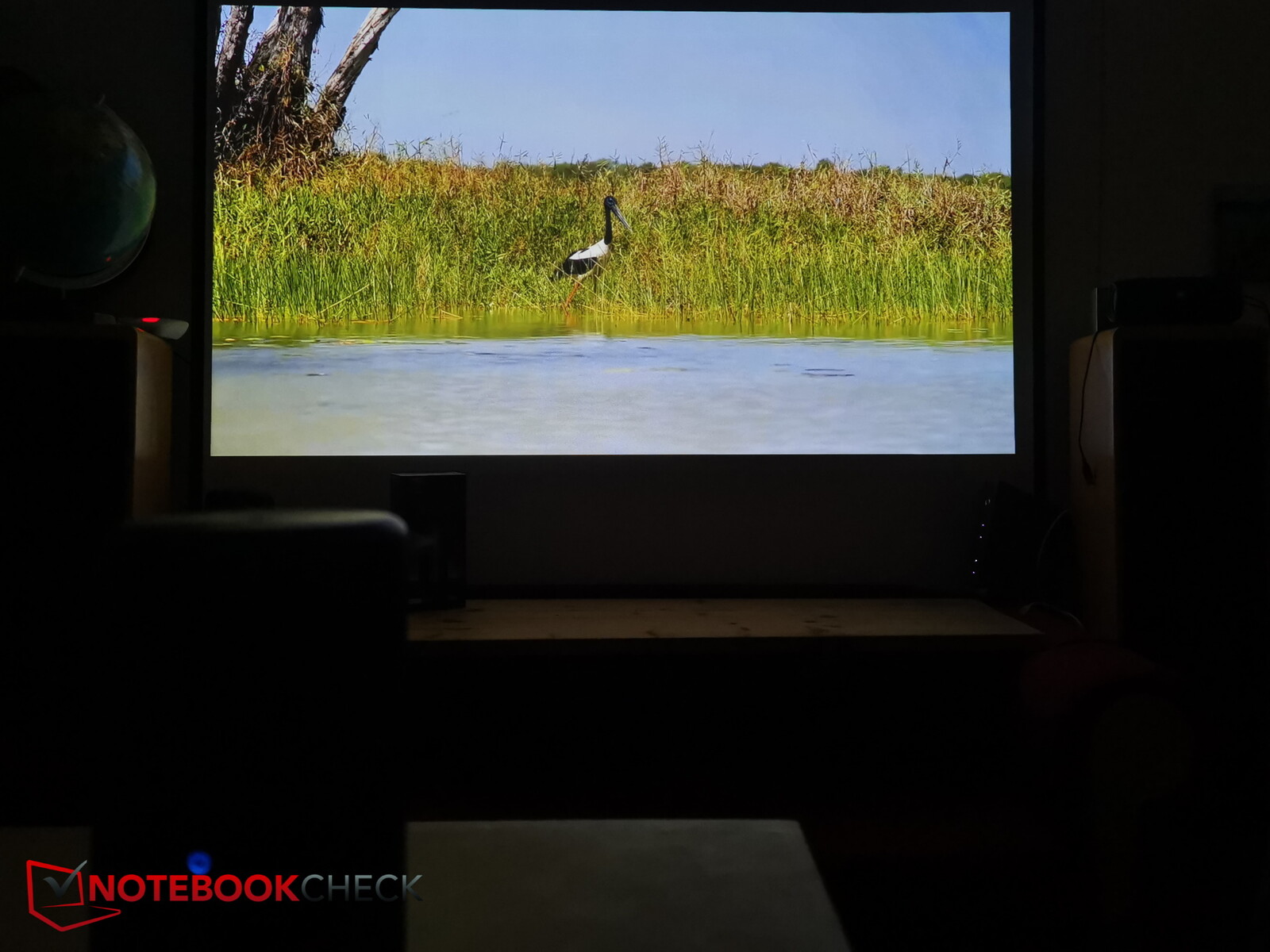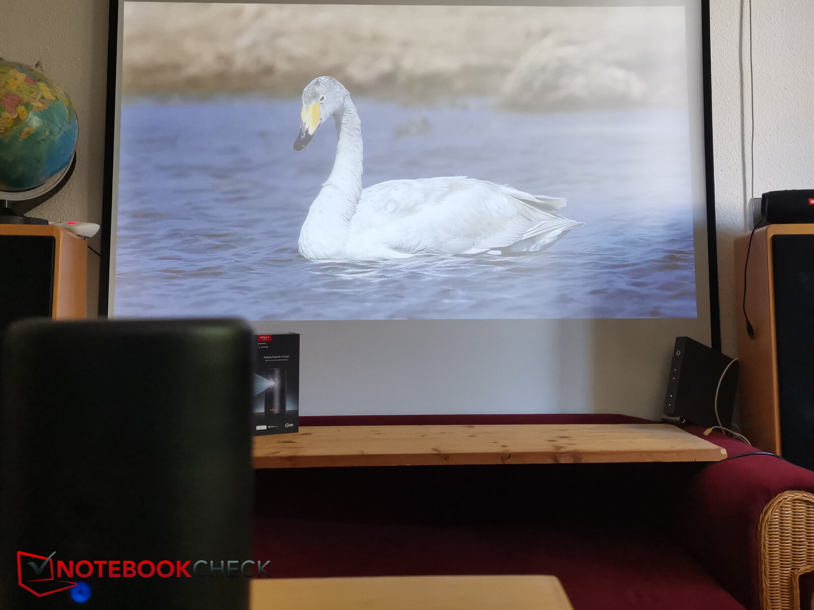 Daneben kann auch die Bildqualität überzeugen, zumindest für einen so kleinen Beamer. Anker gibt 400 ANSI-Lumen an und im abgedunkelten Raum oder dunklen Außenbereichen ist das Bild sehr gut. Das liegt auch an der scharfen und kontrastreichen Laserprojektion. Hinzu kommen die vielen bequemen Automatikfunktionen. Denn eine nach vorne gerichtete Kamera sorgt nicht nur für eine automatische Keystone-Korrektur, sodass das Bild auch bei schräger Projektion gerade gerückt wird. Die Kamera initiiert auch einen automatischen Autofokus, sodass das Full-HD-Bild, natürlich im Rahmen der Möglichkeiten dieser Auflösung, immer optimal scharf ist.