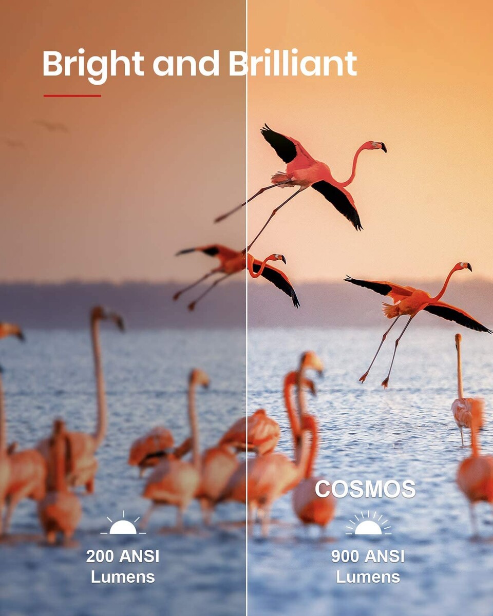 Der Anker Nebula Cosmos projiziert ein Bild mit 1080p-Auflösung bei 900 ANSI-Lumen Helligkeit und HDR10. Anker nennt für die LED-Einheit eine Lebensdauer von rund 30.000 Stunden. Bei 1,6 Metern Entfernung beträgt das Projektionsverhältnis 60 Zoll, bei 3,18 m sind es 120 Zoll. Die Einstellung der Bildschärfe und der Trapezkorrektur erfolgen automatisch.