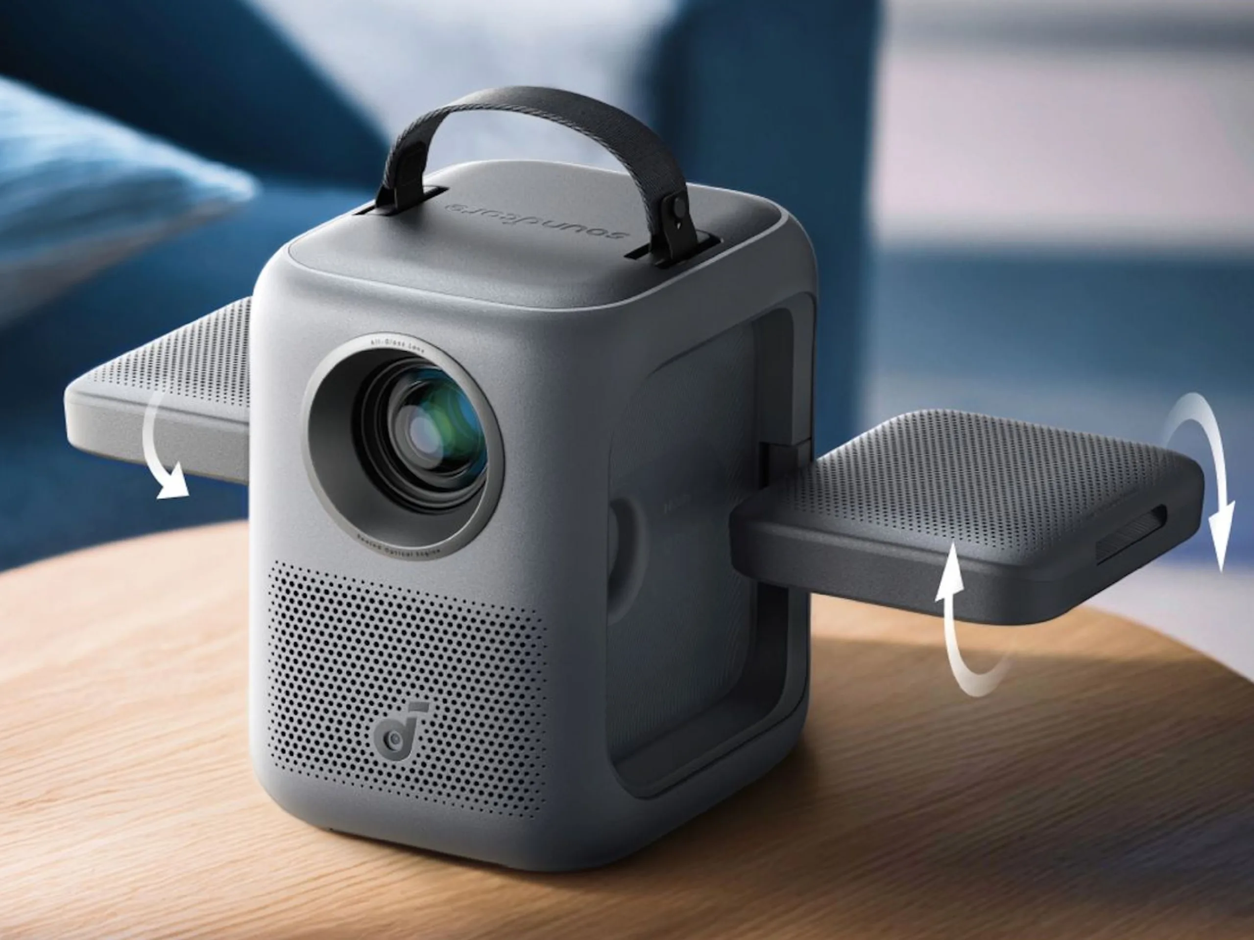Wir haben an dieser Stelle schon sehr oft über Beamer auch für den Außenbereich berichtet und auch über Systeme, die gleich mit einem passenden Soundsystem kommen - auch von Anker. Mit dem Nebula P1i lanciert der Hersteller nun ein weiteres System, welches ebenfalls gleich mit Lautsprechern kommt. Der Nebula P1i Portable Projektor hat diese sozusagen immer am Mann beziehungsweise dem eigentlichem Beamer - und dort bleiben die Lautsprecher auch. So lassen sich diese nicht etwa entnehmen, stattdessen werden diese ausgeklappt. Das hat durchaus den Vorteil, dass diese immer ihren Platz haben, allerdings ist die Platzierung der Lautsprecher nicht sonderlich flexibel möglich. Die Lautsprecher lassen sich aber rotieren, dementsprechend müssen sich Nutzer nicht zwangsläufig vor dem Gerät befinden.