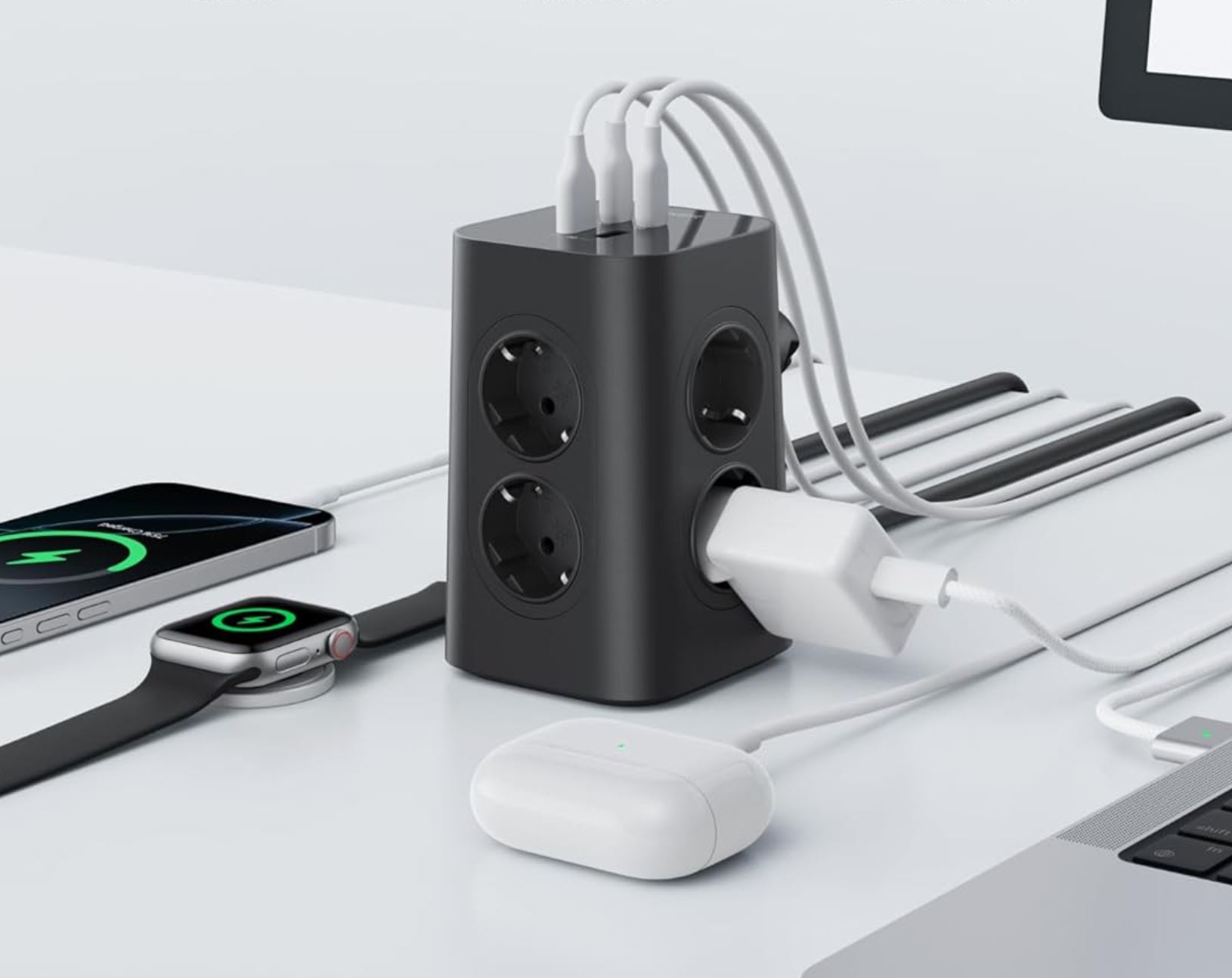 Die Anker Mehrfachsteckdose kann bis zu zwölf Geräte gleichzeitig mit Energie versorgen. Insgesamt acht AC-Steckdosen sind platzsparend auf den vier Seiten der hochkant angeordneten Steckdosenleiste angeordnet. Sie versorgen eingesteckte Geräte mit Wechselstrom, wobei maximal 4.000 W zur Verfügung gestellt werden. Neben einem Schalter an der Rückseite wartet das Produkt auch mit einem 7-Punkte-Sicherheitssystem auf, das Übertemperatur-, Überlast-, Überstrom-, Kurzschluss-, 300J Überspannungs- und Stoßstromschutz sowie Feuerbeständigkeit umfasst.