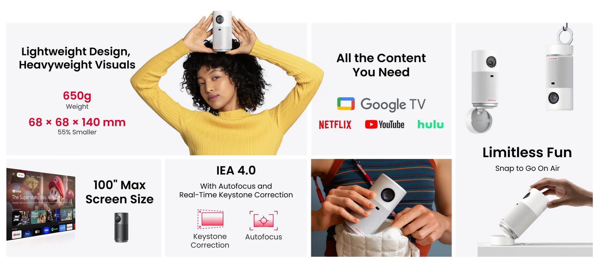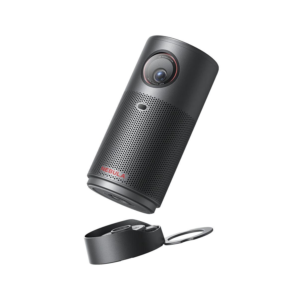 Der Nebula Capsule Air fällt noch kompakter aus und präsentiert sich in dem aus der Serie bekannten Coladosen-Format. Er wiegt nur 650 g und kann mit seinem integrierten 34 Wh Akku bis zu zwei Stunden lang eine 720p-Auflösung mit bis zu 150 ANSI Lumen wiedergeben. Auch hier ist Google TV mit seinen Vorzügen wie der großen Auswahl an Apps im Einsatz. Dank Zubehör kann der Beamer vielseitig genutzt werden, z. B. auf einem Stativ stehend oder kopfüber hängend.