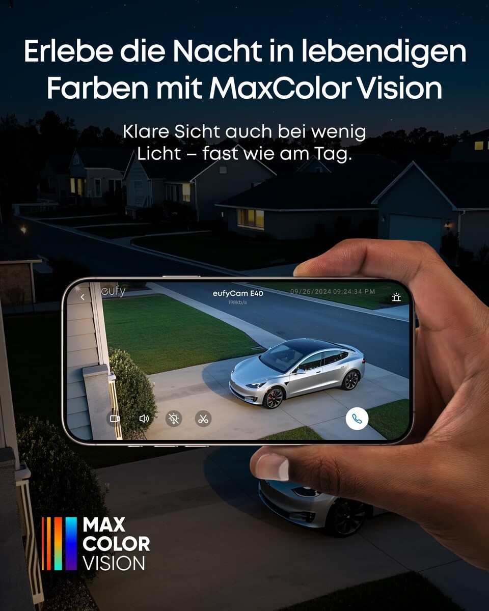 Die eufyCam E40 wird recht präsent mit den Nachtsicht-Fähigkeiten beworben. Herstellerangaben zufolge soll sich durch MaxColo Vision auch bei nur geringer Umgebungshelligkeit ein farbiges Bild erzeugen lassen, wofür auch die F/1.0-Linse einen Anteil an dieser Fähigkeit haben dürfte. Dabei stehen insgesamt drei Nachtsichtmodi bereit, so lässt sich nicht nur ein Farbbild bei schwachem Licht erzeugen, stattdessen stehen noch ein Spotlight-Modus und der klassische Infrarot-Modus ohne Farbdarstellung zur Verfügung.