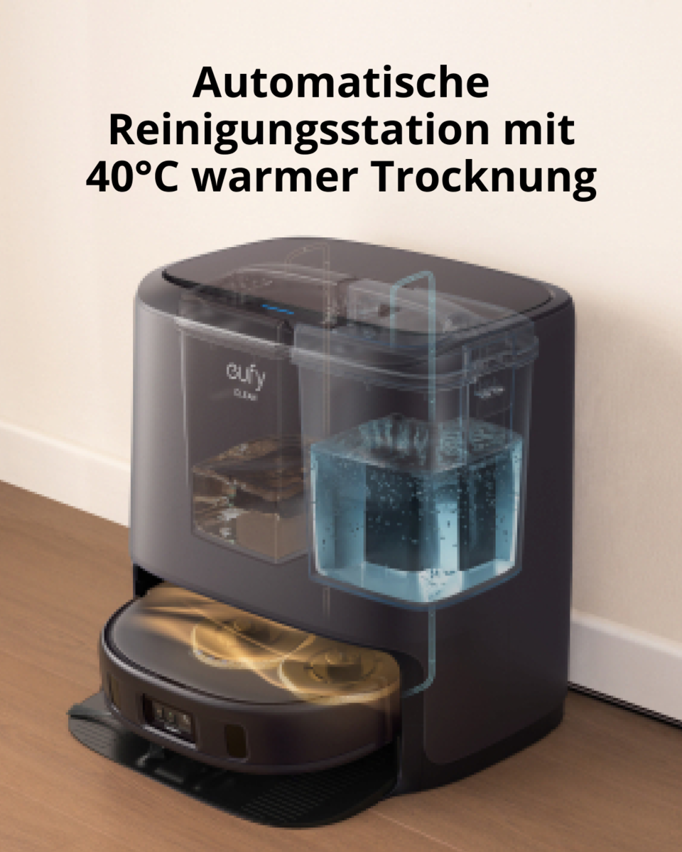 Gemeinsam mit dem Saug- und Wischroboter wird eine passende Lade- und Reinigungsstation geliefert. Diese kümmert sich unter anderem um die Reinigung der Wischmopps und trocknet sie anschließend der Hygiene zugutekommend mit 40 Grad warmer Luft - ähnlich wie also auch einige andere teurere Kontrahenten wie der Ecovacs Deebot X1 Omni (ca. 950 Euro bei Amazon) oder der Roborock S8 Pro Ultra (ca. 1.500 Euro bei Amazon).