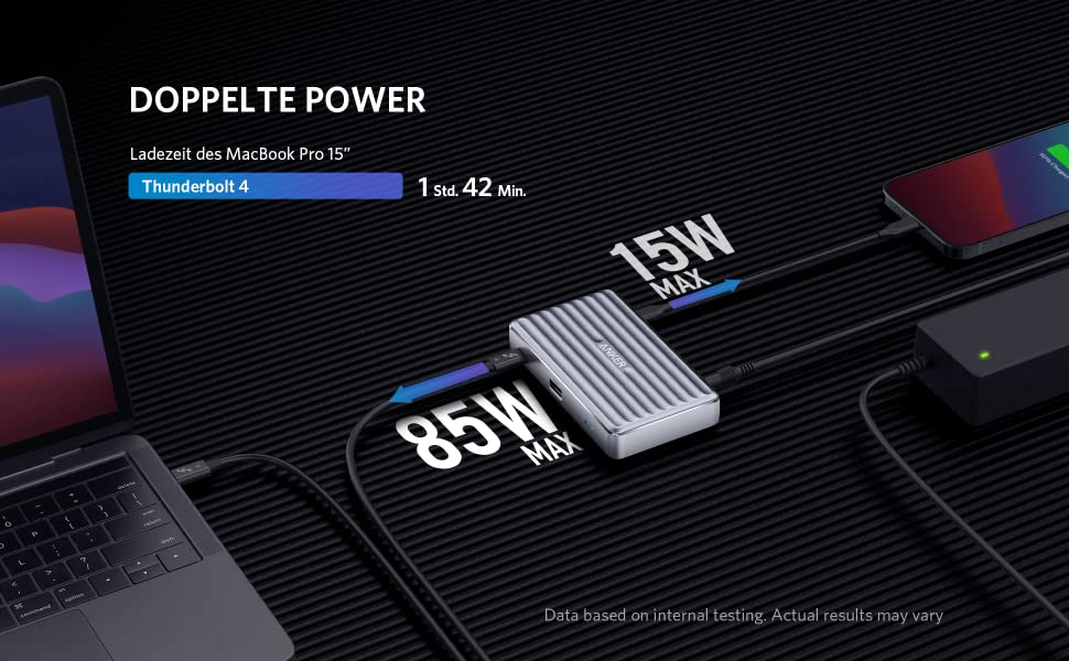 Klein, aber oho! Anker präsentiert mit seiner PowerExpand 5-in-1 Thunderbolt 4 Mini Dock (bei Amazon für 199,99 Euro) einen echten Kraftzwerg, der mit zahlreichen Anschlüssen und einer enormen Power aufwartet. Unter anderem stellt die Anker PowerExpand 5-in-1 Thunderbolt 4 Mini-Dock vorne, über einen 85 Watt Thunderbolt 4 Upstream-Eingang (Laptop-Anschluss) mit 40 Gbps, genug Ladeleistung zur Verfügung, um ein Apple MacBook Pro 15" in nur 1 Stunde 42 Minuten voll aufzuladen. Außerdem besitzt die Anker PowerExpand 5-in-1 vorne zudem einen USB Typ-A-Port.