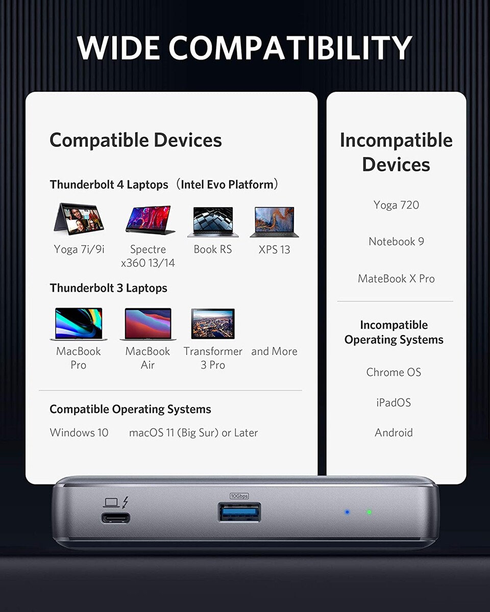 Hinten ist der Netzeingang für das mitgelieferte 100-Watt-Netzteil sowie der Ein-Aus-Schalter angeordnet. Außerdem befinden sich an der Rückseite drei Thunderbolt 4-Downstream-Ports, die jeweils bis zu 15 Watt liefern können. Der Thunderbolt 4 Downstream-Port unterstützt die Datenübertragung auf einen einzelnen Bildschirm mit bis zu 8K @30Hz und auf zwei Displays mit bis zu 4K @60Hz. Einschränkung: Apples MacBook Air und MacBook Pro 2020 mit M1-Chip unterstützen lediglich Übertragung auf einem einzelnen Monitor.