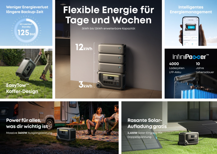 Neben einer USV-Funktion für eine unterbrechungsfreie Stromversorgung bietet die Anker Solix F3000 in typischer Manier noch diverse USB-Ports mit bis zu 100 W sowie weitere Anschlüsse. Geladen werden kann die mächtige Powerstation beispielsweise mit bis zu 2.400 W per Solarpanels oder mit maximal 1.800 W über das Stromnetz.