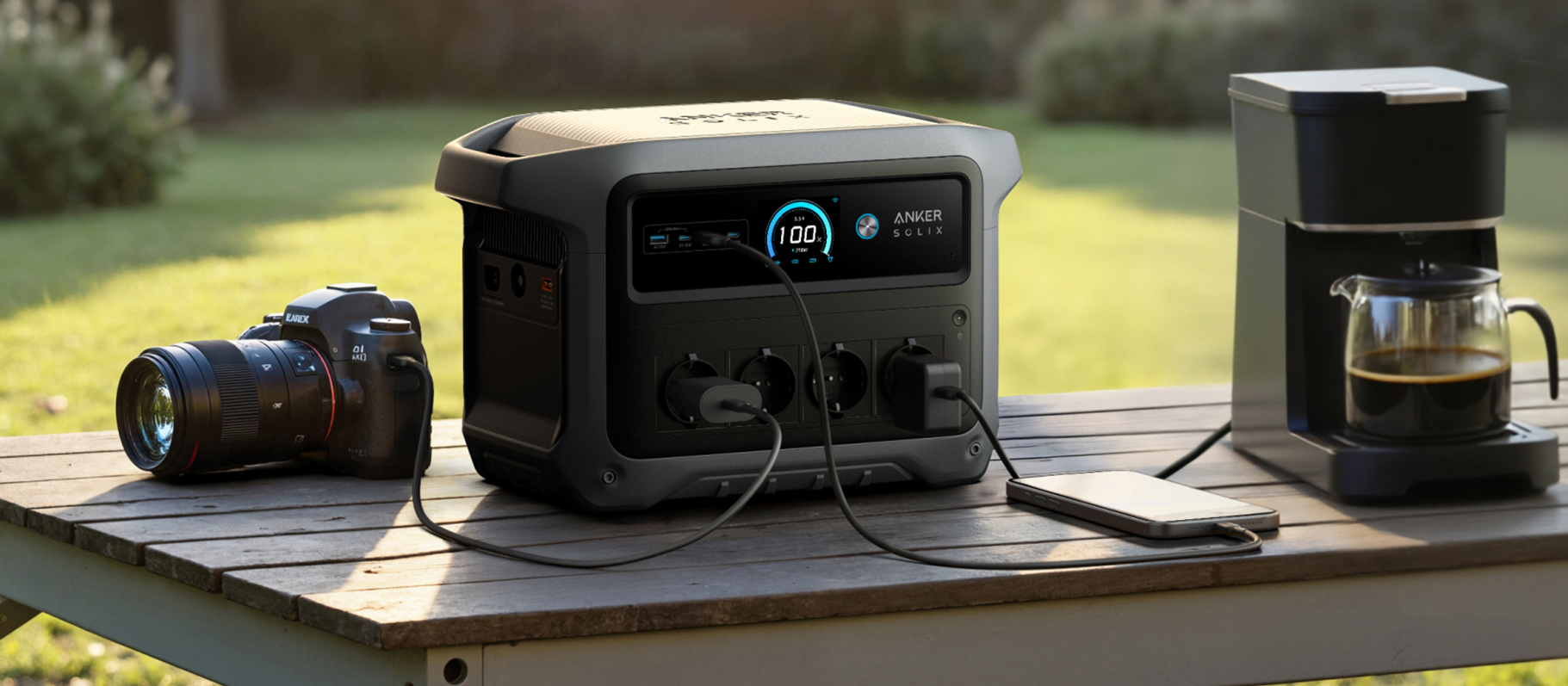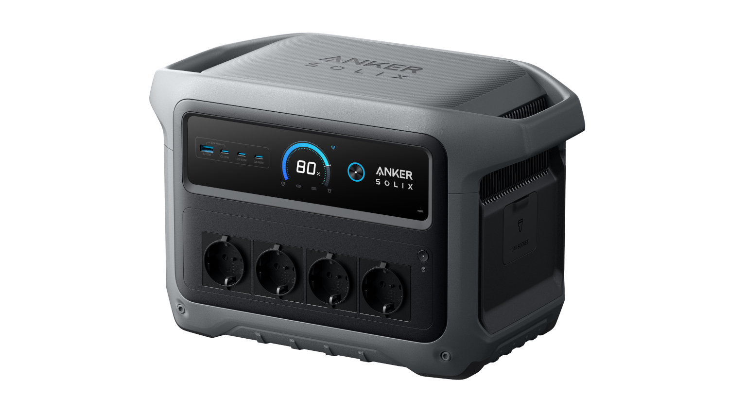 Auch bei der Dauerleistung von 2.000 W gibt es eine Steigerung. Kurzfristig sind bis zu 3.000 W Spitzenleistung möglich. Bis zu neun Geräte lassen sich mit der 11,3 kg wiegenden Powerstation zeitgleich laden, da neben vier Steckdosen auch vier USB-Anschlüsse (2x 140W USB-C, 1x 15W USB-C, 1x 12W USB-A) und eine 12-V-Steckdose (Zigarettenanzünder) verbaut sind.